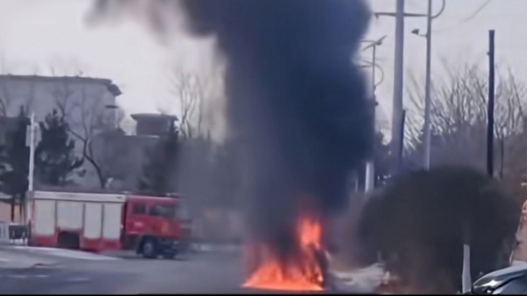 紧接着就出现了熊熊大火,噼里啪啦类似烟花一样,整车瞬间就烧成了骨架,人员无法靠近。消防部门迅速赶到,把火扑灭,此事故无人员伤亡。