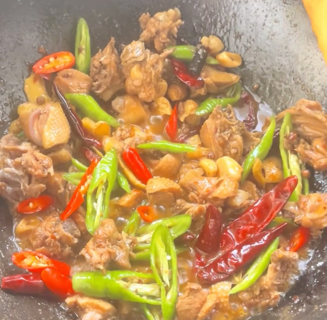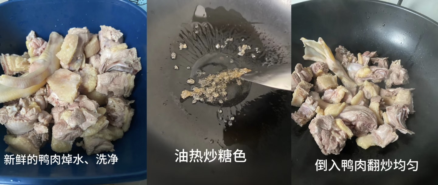然后就是炒糖色,这也是让啤酒鸭色泽红亮诱人的秘诀。锅中放少许底油,下入冰糖,小火慢慢炒化。当冰糖完全融化并变成琥珀色的泡沫时,迅速倒入沥干的鸭块,快速翻炒,让每一块鸭肉都均匀地裹上糖色。这一步动作要快,以免糖色炒过头变苦。