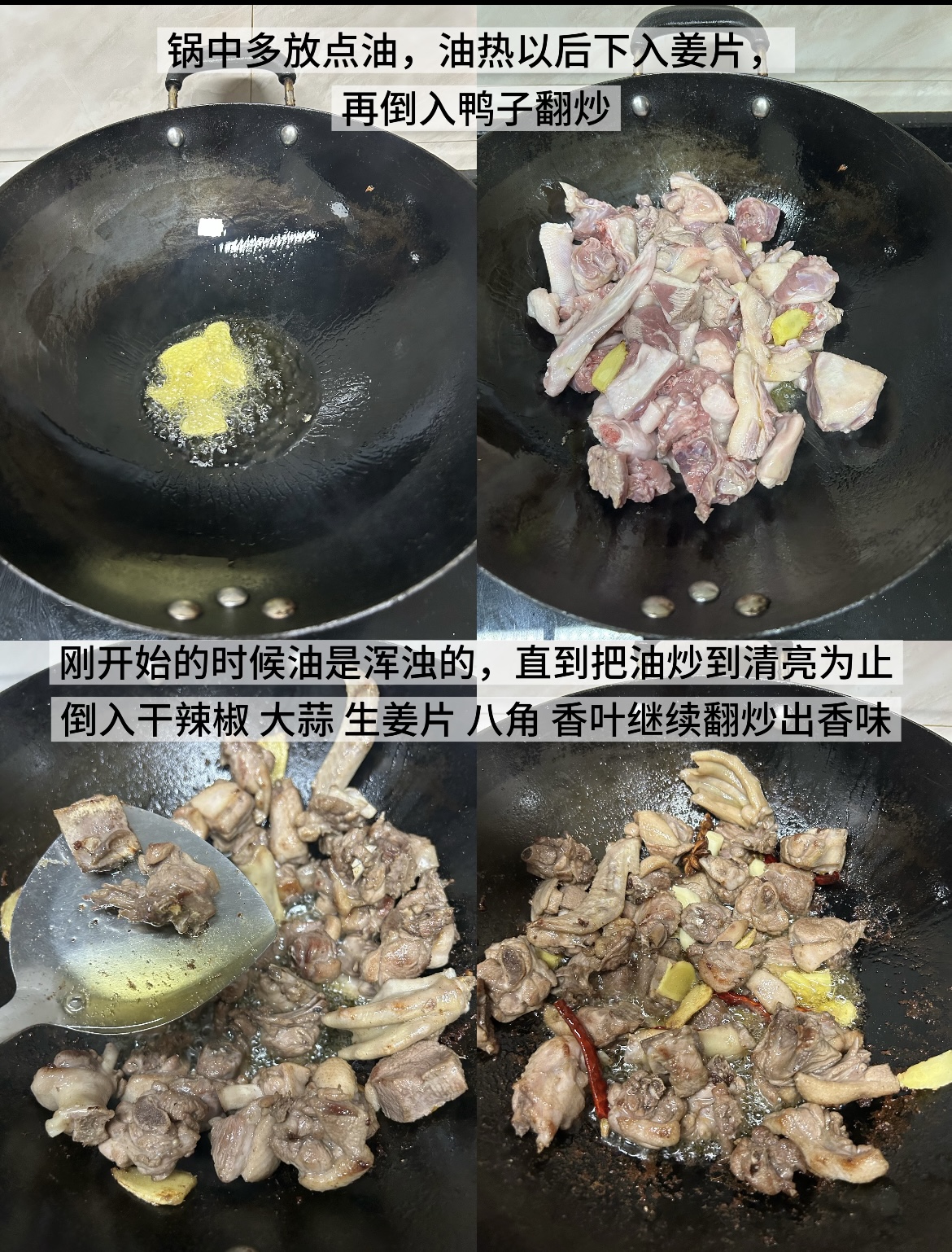糖色炒好后,加入姜片、大蒜、干辣椒、桂皮、八角、香叶,继续中小火煸炒出香味。此时可以沿着锅边淋入一勺料酒,进一步去腥增香。待鸭肉表面微微焦黄,香味四溢时,倒入准备好的啤酒,啤酒的量要没过所有鸭肉。