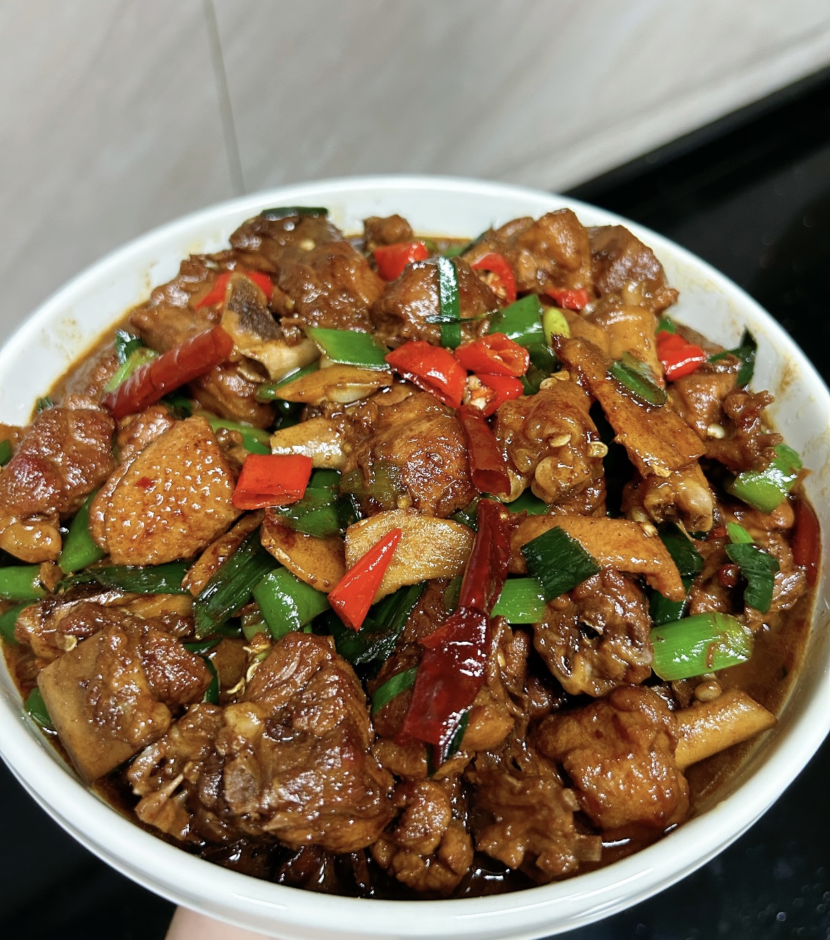 当汤汁减少到一半,鸭肉用筷子能轻松扎透时,可以尝一下味道,根据个人口味补充适量的盐。然后转大火收汁,让汤汁变得浓稠,紧紧地包裹在鸭肉上,这样味道才更足。最后,撒上一把葱花或香菜段,即可关火出锅。