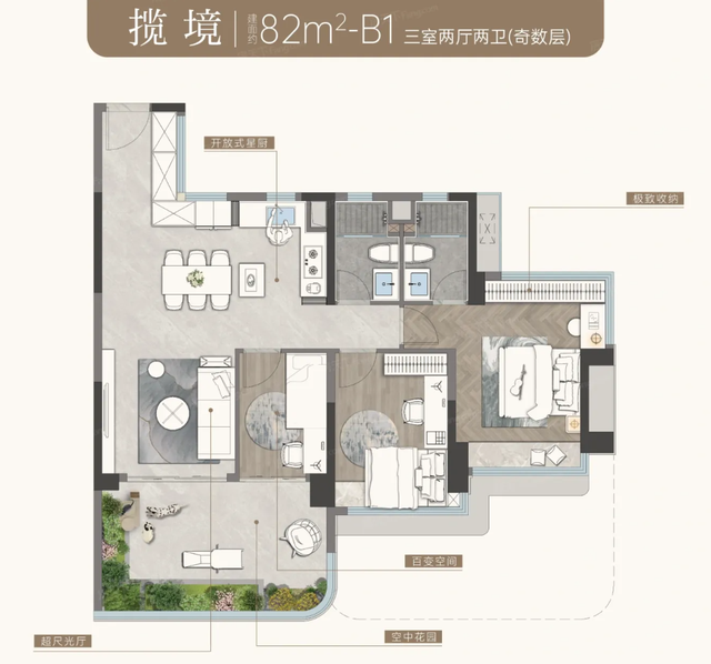 招商林屿境住宅户型体系覆盖高层主力段82-155㎡,从三房、四房到可拓空间百变房型,多元选择面向不同类型家庭需求。项目采用“超大阳台+高使用率+空中花园”产品理念,打造出广州首个四代住宅作品:户型实用率普遍达到110%-140%,约25%阳台率及高达40%户属空间空中花园设计,将景观、生活与社交自然融合。