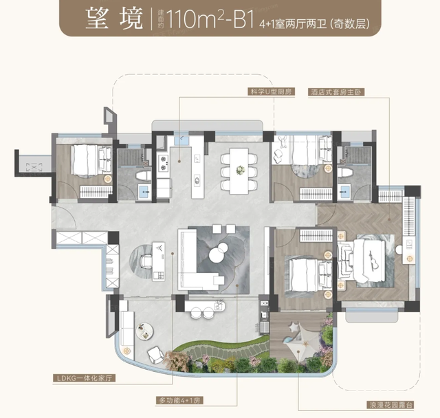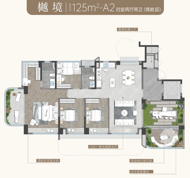 125㎡四房户型,全明全通透、动静分区明显,部分户型引入“中庭空中花园”理念,使室内外景观无缝衔接。独立玄关、套房式主卧、景观阳台和连通多功能空间,交融私密与开放。得益于前后两排均为低密度设计,中央园林无遮挡,视野与通风俱佳。