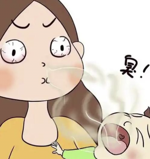 喂养过量、辅食添加过快、暴饮暴食,导致食物堆积在肠胃无法消化,发酵产生的气体反流至口腔,形成酸腐口臭,还伴随腹胀、便秘、食欲差、睡眠不安、手心脚心发热。
