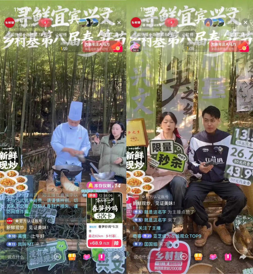 活动当天,乡村基开启全天春笋节直播,以“实景溯源、互动体验、现炒现赏”为核心,镜头全程聚焦兴文鲜笋基地,从茂盛竹林的寻笋环节,到笋农与主播携手挖笋的趣味场景,再到大厨现场掌勺烹制鲜笋佳肴,全方位呈现鲜笋从采摘到成菜的完整链路。直播间还为全国网友发放兴文石海景区门票、春笋福袋、乡村基代金券等多重福利,让网友在云端实现“云赏竹海风光、云品兴文鲜笋”的沉浸式体验,带领广大食客溯源兴文鲜笋的春日鲜味。