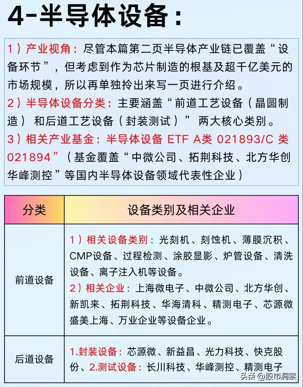 第二是“半导体产业链与设备”。这是一个涵盖设计、制造、封测及上游材料设备的庞大生态。从海思、寒武纪等芯片设计,到中芯国际等制造龙头,再到沪硅产业等材料供应商,自主体系日益完善。其中,作为产业根基的半导体设备(市场规模超千亿美元)尤为关键,前道的光刻、刻蚀,后道的封装、测试设备,由上海微电子、中微公司、北方华创等企业奋力攻坚。
