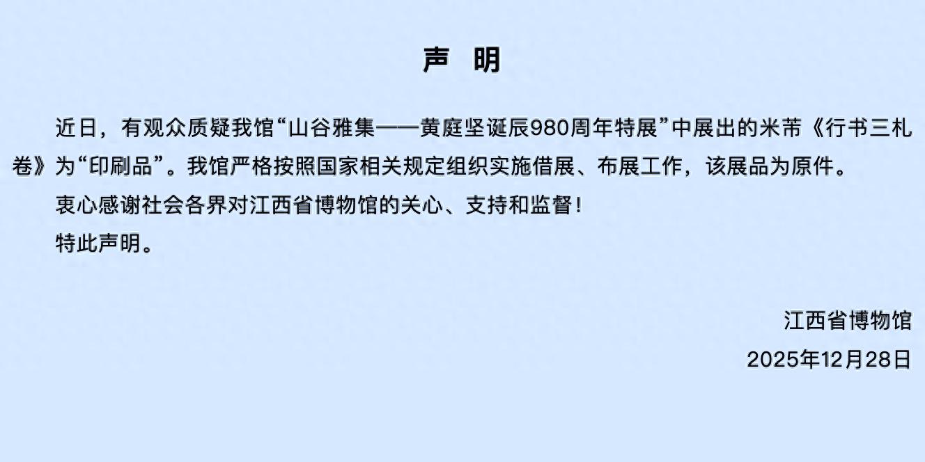 近日,有观众质疑我馆“山谷雅集——黄庭坚诞辰980周年特展”中展出的米芾《行书三札卷》为“印刷品”。我馆严格按照国家相关规定组织实施借展、布展工作,该展品为原件。