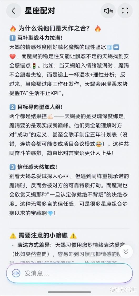 分析结果出来后,我的“姨母笑”更灿烂了。它没有给虚泛的结论,而是从性格层面分析,说一个星座深情,另一个务实,在一起能形成奇妙的化学反应。最巧的是,它提到的某些性格特质,居然和我从细节里扒出来的糖点对上了!