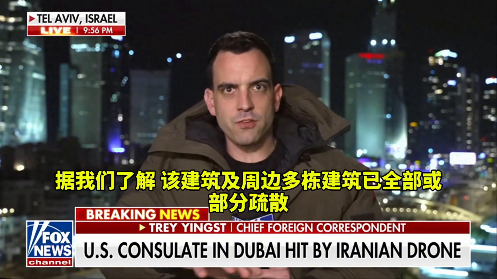 特雷,好的,大家下午好,我们正在跟进迪拜的报道。有消息称伊朗无人机袭击了美国驻迪拜领事馆,据我们了解该建筑及周边多栋建筑已全部或部分疏散,再次说明这些均为初步报道。福克斯新闻的詹妮弗·格里芬也证实该区域遭遇袭击。