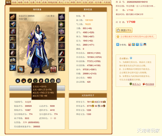 来自【少林寺】服务器的39万评分内功慕容,先看看面板:血量106万,裸内功攻击19.1万,玄攻击13113。
