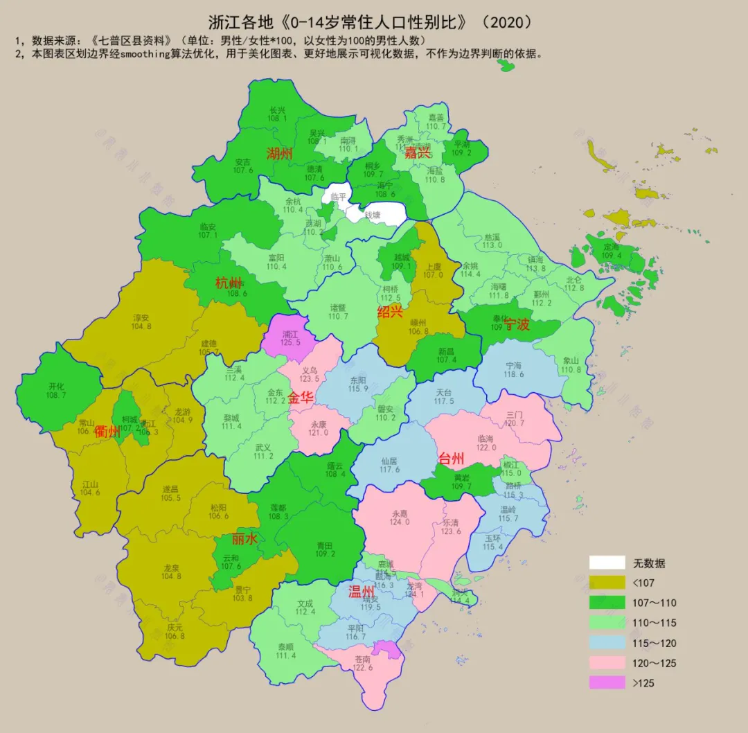 从这张分区县地图可以清晰看到,浙江的性别比分布呈现出鲜明的板块特征。浙西南的衢州、丽水地区被大片的绿色覆盖,常山(106.3)、龙泉市(104.8)等县市的数据接近国际公认的正常范围。