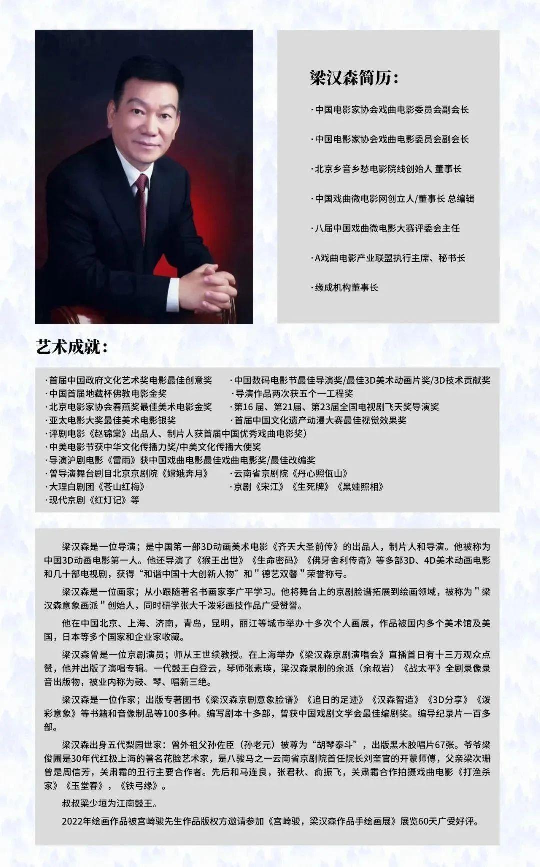 作为中国电影家协会戏委会副会长、中国戏曲微电影网创立人、连续九届中国戏曲微电影盛典评委会主席,梁汉森始终致力于推动戏曲与影视的融合发展。他创办的北京乡音乡愁电影院线,为戏曲电影搭建了专属放映平台;A 戏曲电影产业联盟的成立,则整合了产业链上下游资源,为戏曲电影的创作与传播注入新动能。