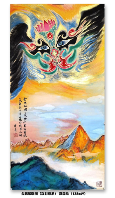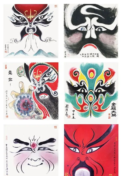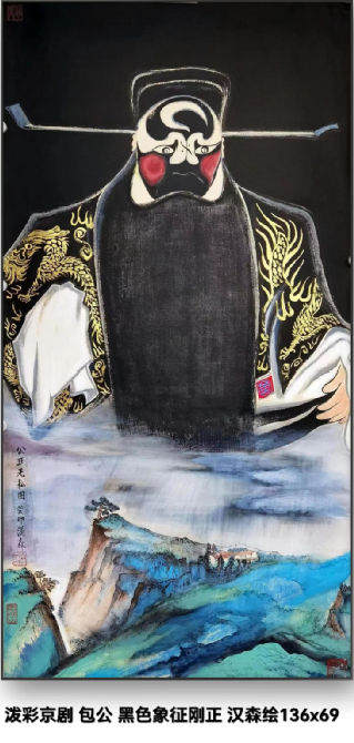 他开创性地将京剧脸谱引入绘画领域,创立 “梁汉森意象画派”。把京剧脸谱变成一种绘画,是梁汉森最重要的创举——他把水墨丹青的笔法和京剧脸谱的画法相结合,同时加入了电影电视语言的视觉冲击力画面感,使三者在相互吸取融合并进行转化、融化和叠化后,创作出了让老百姓便于观赏的新画种,这使传统文化得到一种深入人心的启示。