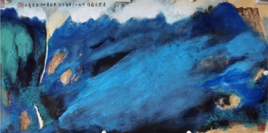 同时,他研学张大千泼彩画并融会贯通,创新推出《神韵东方》泼彩京剧系列画作。他将泼彩青绿山水与脸谱意象相结合,让五光十色的脸谱在张大千式的山水意境中交融,营造出气势磅礴的艺术格局。“周信芳的豪情粗犷与余叔岩的中正平和,都能在笔墨中找到呼应。” 梁汉森将京剧艺术的韵味融入绘画,让作品兼具泼墨的气势与装饰的韵味。
