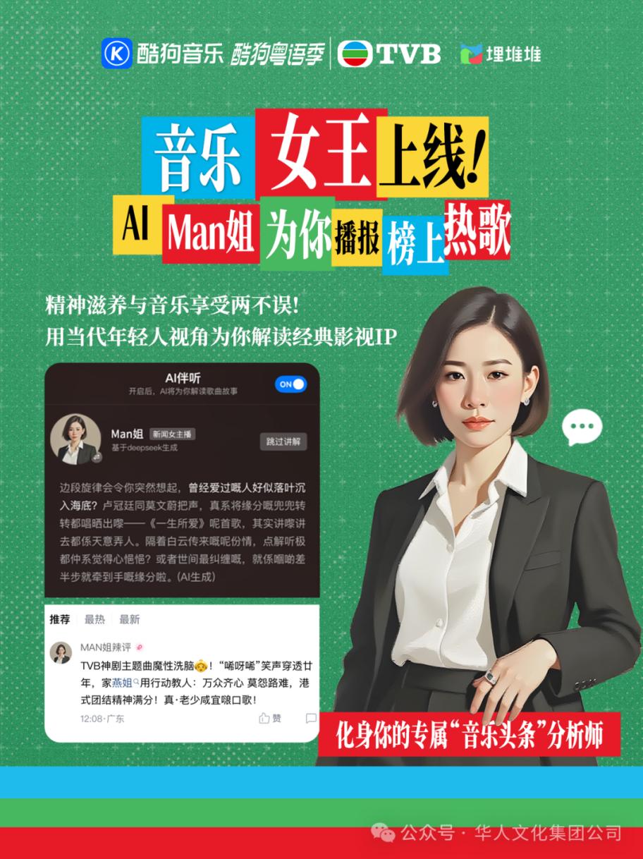不仅如此,专区内还设置了AI伴听及AI唱功能,TVB经典角色“Man姐”将化身AI-Man姐深挖每一首歌曲背后的故事,带着听众们感受全新姿态的港剧OST,一起挖掘港乐风潮。