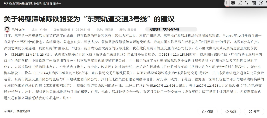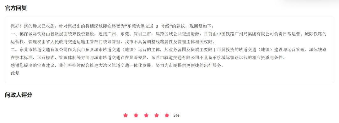 所以他通过问政平台,向东莞官方建议穗深城际铁路变为“东莞轨道交通3号线”。