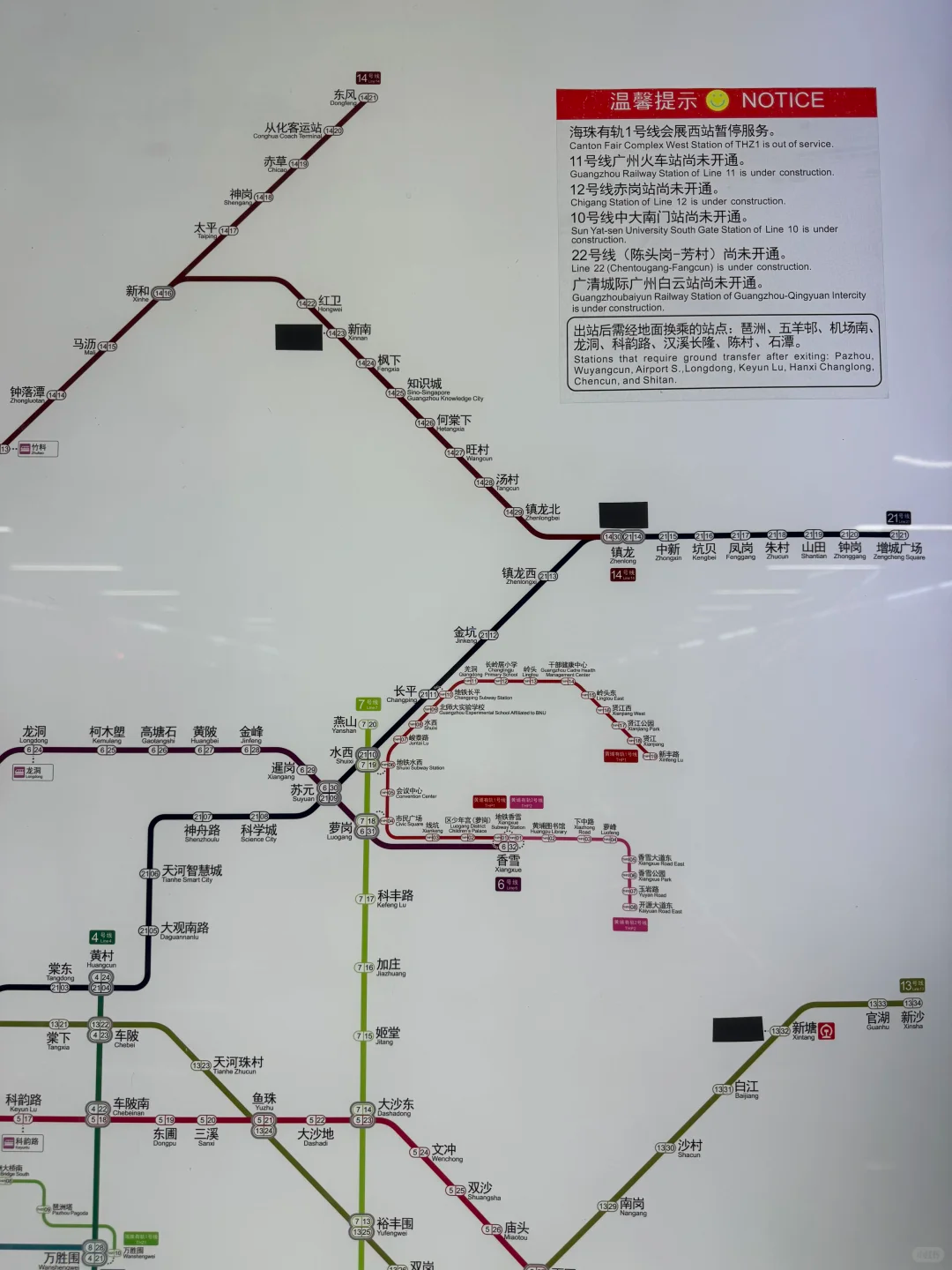 有网友拍到,鹅掌坦站的线网图,已标注有穗深城际镇龙站、九佛站和新塘南站,只是被贴纸遮挡住。