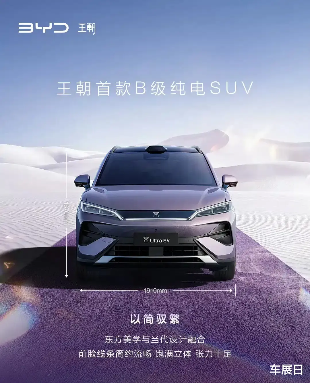 比亚迪宋Ultra EV发布了官图。采用简洁设计思路,传承王朝家族设计语言,悬浮式车顶和富有力量感的车身腰线,融合了宋L EV和宋L DM - i的设计精髓。车身长宽高4850/1910/1670mm,轴距2840mm,尺寸超过宋L DM - i,比宋L EV高,空间更大。它配备了激光雷达,预计搭载天神之眼B,支持城区和高速辅助驾驶。
