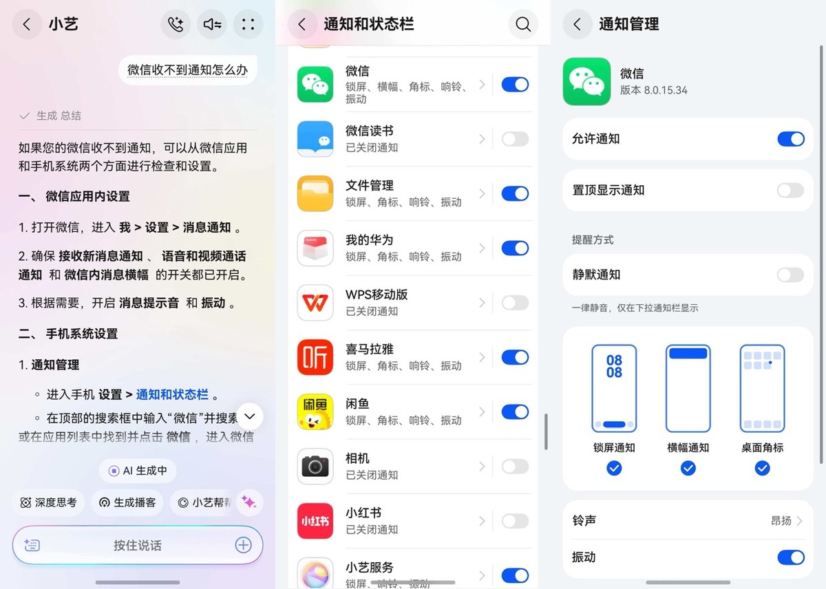 如果微信收不到消息提醒,先别慌,试着问小艺“微信收不到通知怎么办”。小艺会帮你从微信应用和手机系统设置方面排查原因,点击回答里的蓝色字体,能够直达设置页,比自己手动找可快多了。