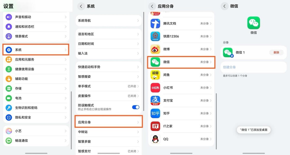 现在很多人习惯将工作号和私人号分开,过年期间工作消息不能不看,个人号的祝福也要回。这时候就可以用鸿蒙系统自带的“应用分身”功能:进入手机设置找到“系统”,点击“应用分身”,把微信的开关打开就行。两个账号同时在线,不必来回切换,消息都能立刻收到、及时回复。