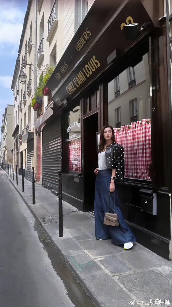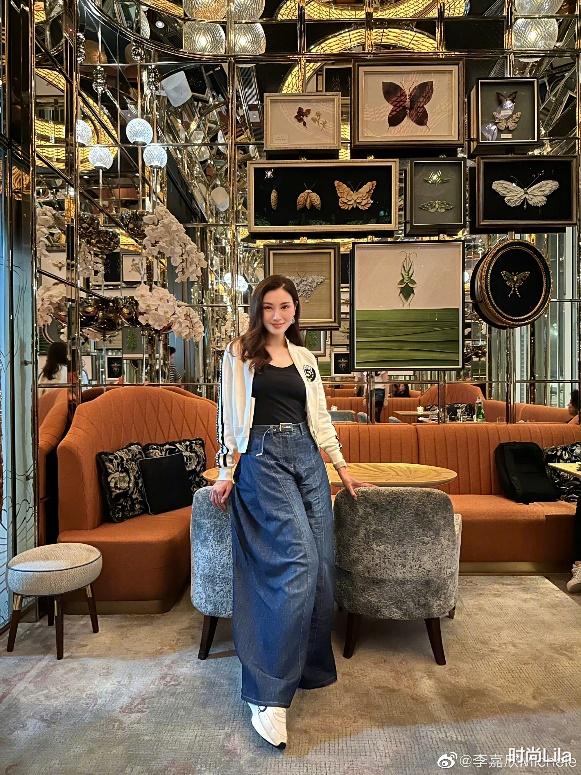 在搭配上,同一条裤子,还可以选择不同的上衣款式来营造时尚感,像是李嘉欣选择的波点小夹克与白T单品的搭配就很高级,黑白、蓝的三色搭配经典耐看又稳熟,短式上衣与高腰阔腿裤的搭配完美显高身材比,高阶风的熟女路线还很洒脱有范,将50+女性的时尚尺度拿捏得刚刚好。