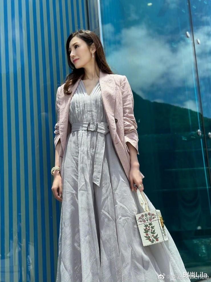 OL风满满的西服单品,想要在气韵上的彰显更年轻靓丽,浅色西服是不错的选择,像李嘉欣这款藕粉、奶油黄以及浅灰蓝等色调的西服都可以作为穿搭,它们呈现出的西服气质不仅温婉雅致,与连衣裙的搭配还很得体大方,既不失中年女性的优雅迷人,又能穿出减龄洋气的都市OL感。