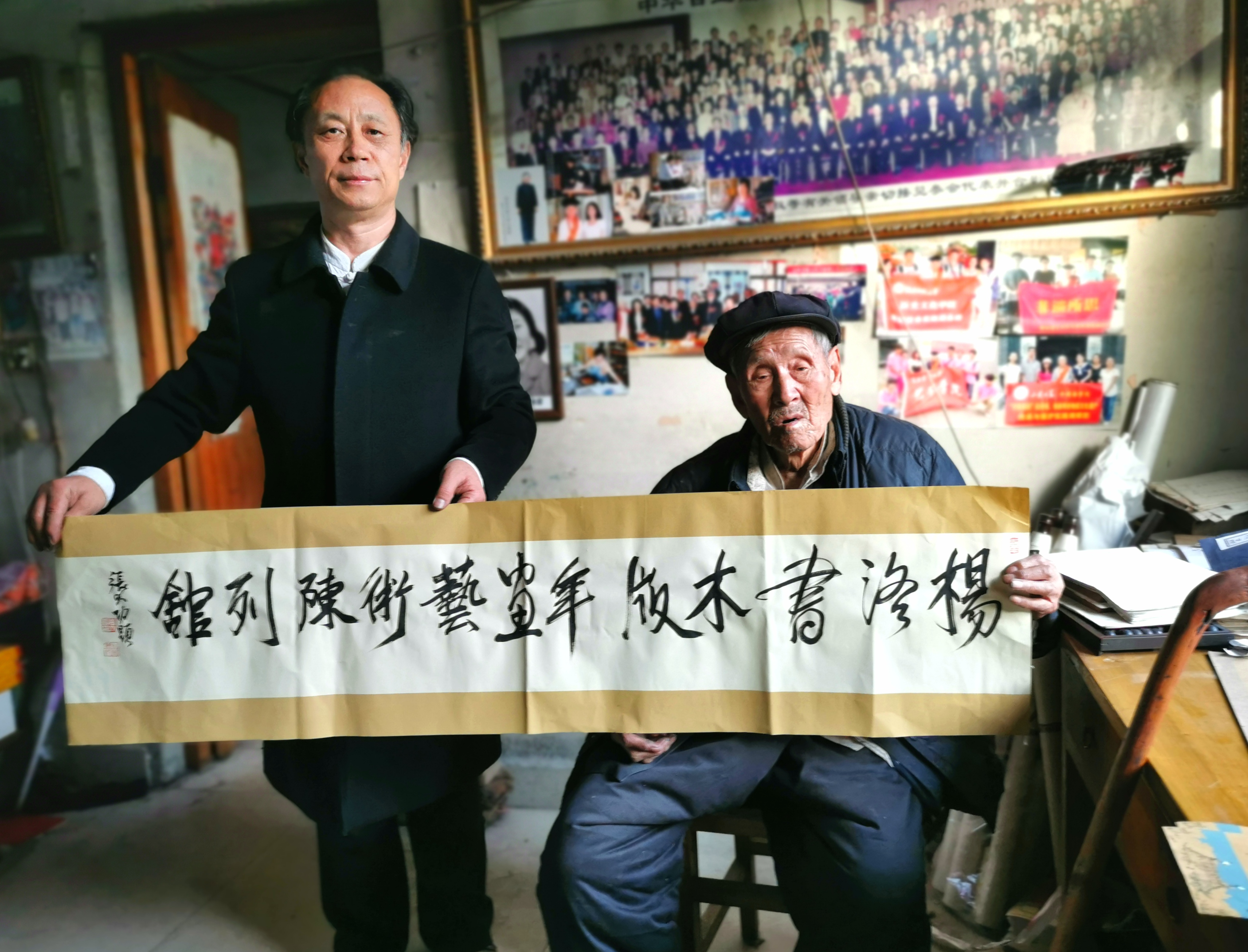 △2022年12月8日,九十六岁高龄的杨洛书先生在家中与张大功一起展示张大功为他成立陈列馆书写的“杨洛书木版年画艺术陈列馆”匾额。(资料图片)
