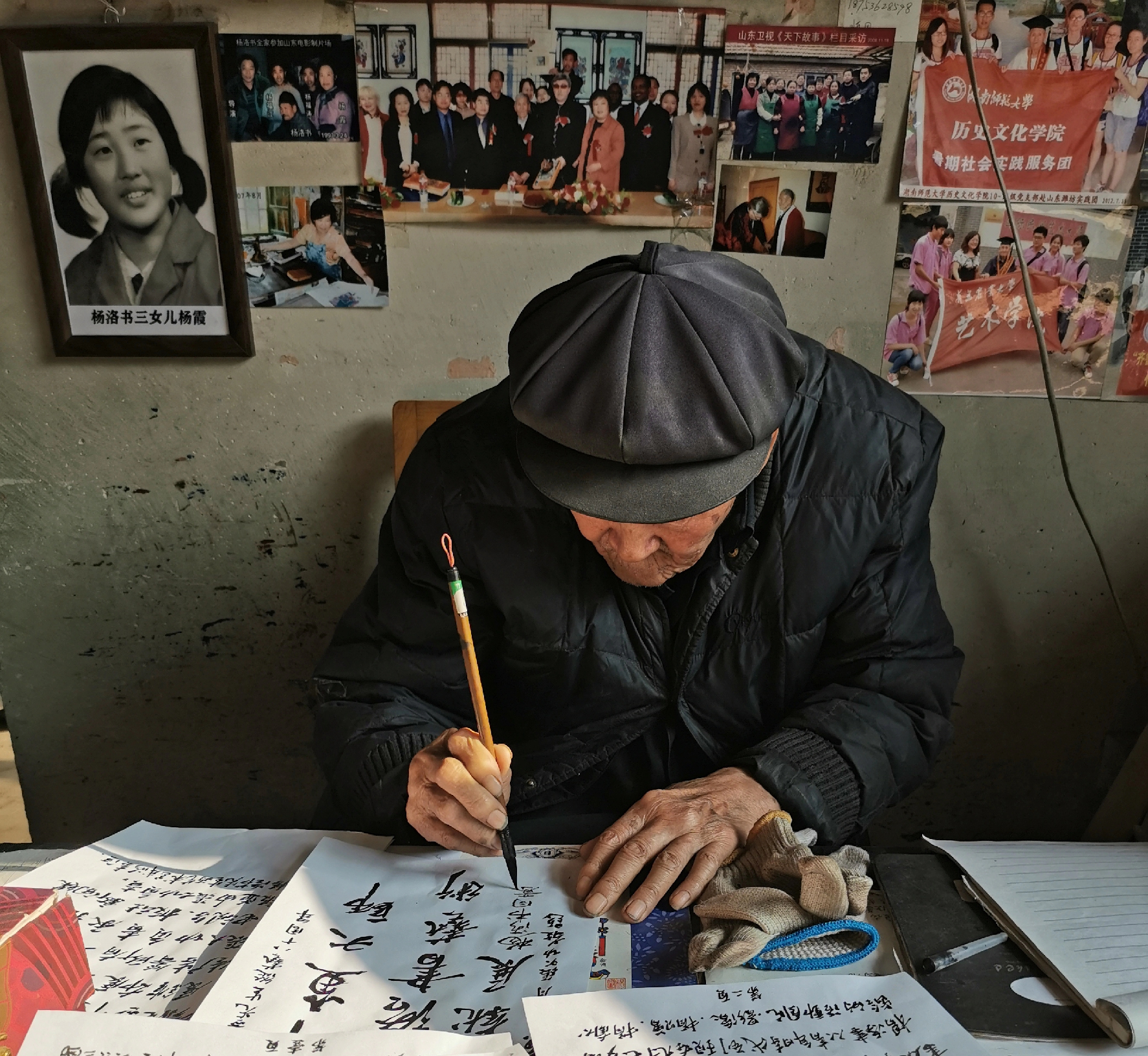 2022年12月8日,九十六岁的杨洛书老人在张大功20多年前收藏他的大门神等五幅木版年画上签名题字。这是杨洛书老人最后的签名作品。(资料图片)