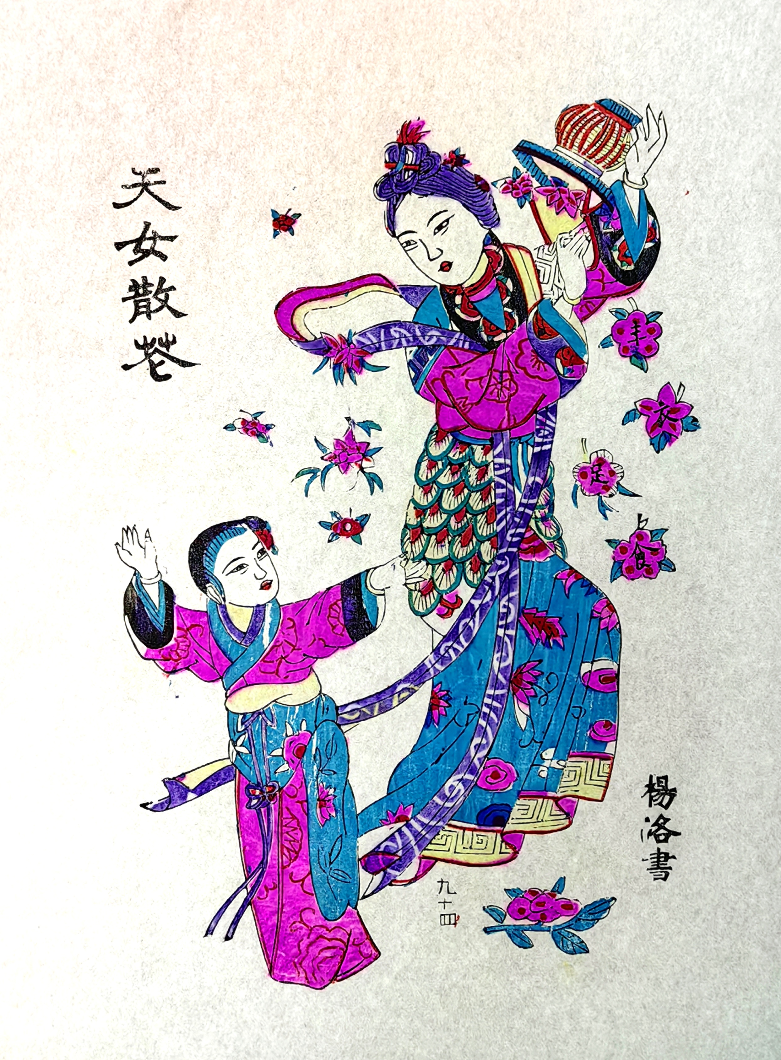 △潍坊杨洛书木版年画艺术陈列馆馆长张大功向吉林市美术馆捐赠他收藏的民国时期的木版年画《天女散花》作品。