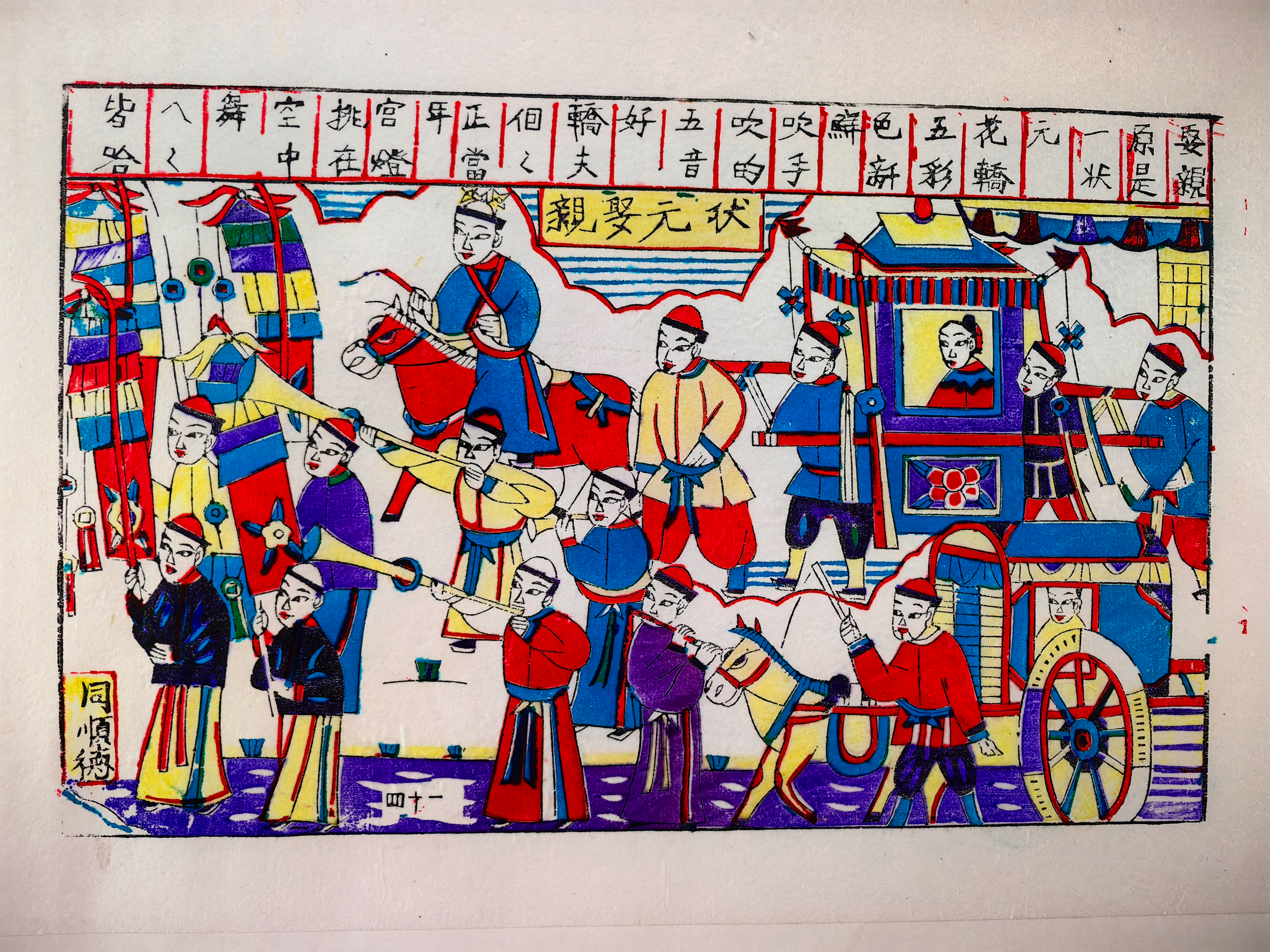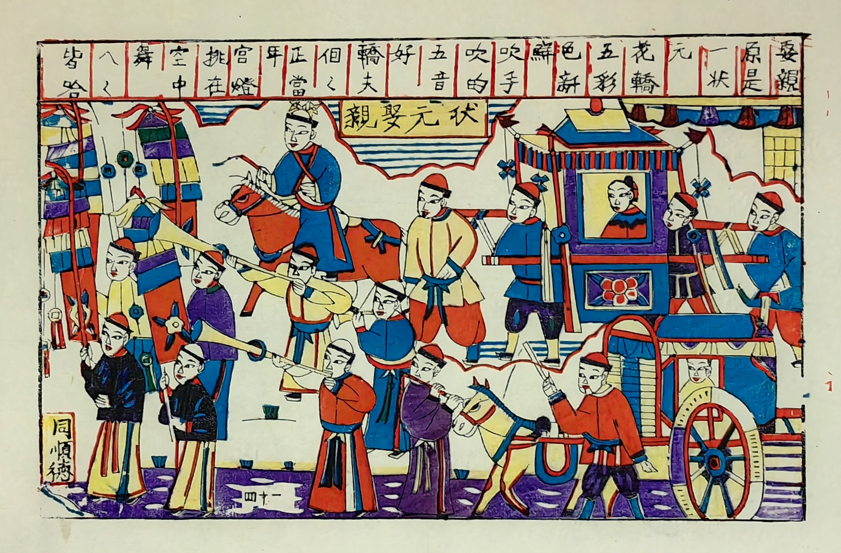 △潍坊杨洛书木版年画艺术陈列馆馆长张大功向吉林市美术馆捐赠他收藏的清代木版年画《状元取亲》作品。