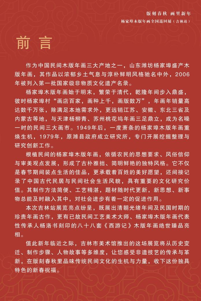 △版刻春秋画里新年潍坊杨家埠木版年画全国巡回展在吉林市美术馆开幕。图为展览前言。