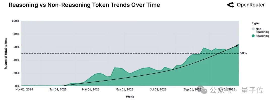 年初时,模型使用推理的Token用量还可以忽略不计,但现在已经超过50%。