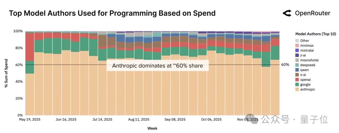 Anthropic显然是当之无愧的程序员,其80%以上流量均用于编程和技术任务。