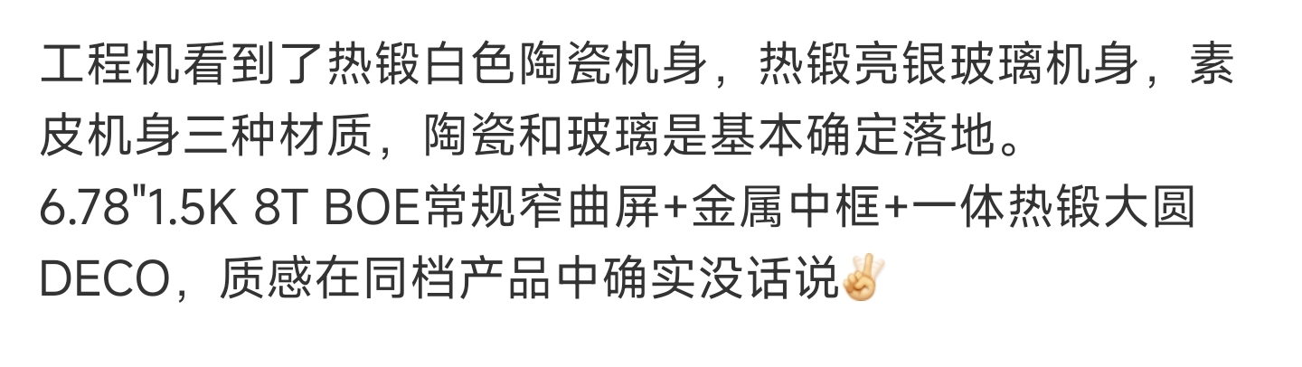 知名科技大V透露,一加13工程机看到了热锻白色陶瓷机身,热锻亮银玻璃机身,素皮机身三种材质,陶瓷和玻璃是基本确定落地。 6.78"1.5K 8T BOE常规窄曲屏+金属中框+一体热锻大圆DECO,质感在同档产品中确实没话说。
