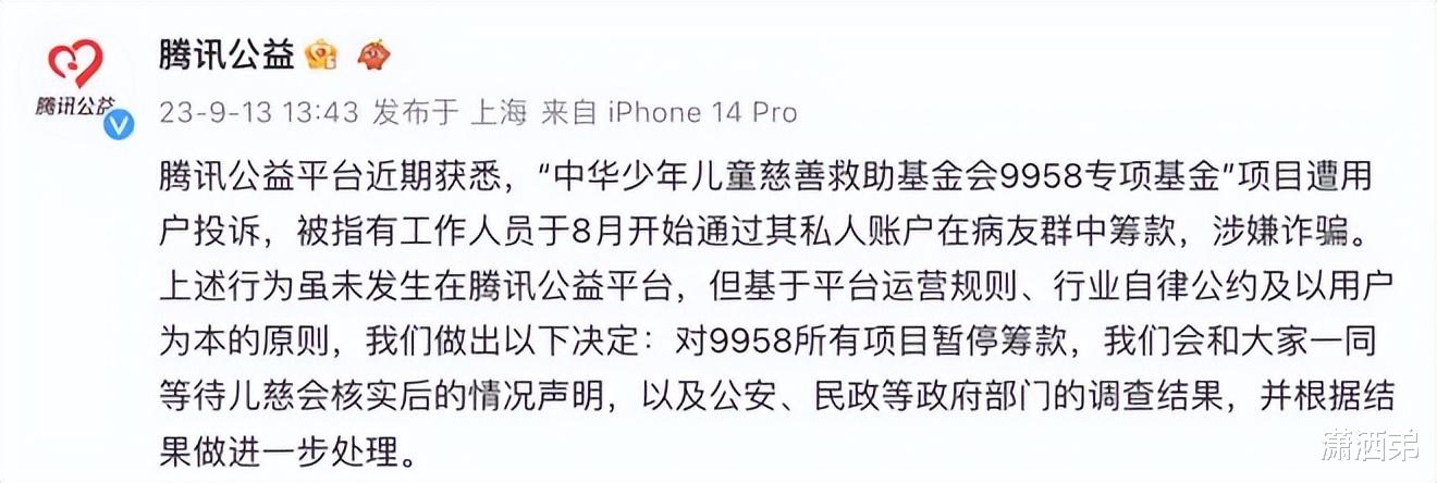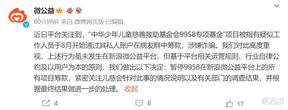 媒体还报道,这个中华儿慈会2022年该项目收入2.272亿元。在27个重大公益慈善项目中最高。对于此事,腾讯,微博等平台公益账号也发布通知,暂停对这个项目进行筹款。