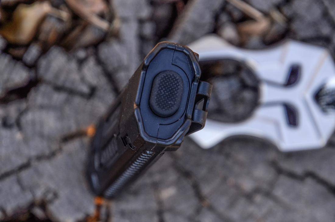 EDC07的尾部是主开关,长圆形的胶帽,防滑效果好,8×12mm大小,周围是带凹槽的四点支撑凸起,既不影响倒立放置使用,也方便手指按压按键。