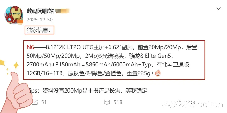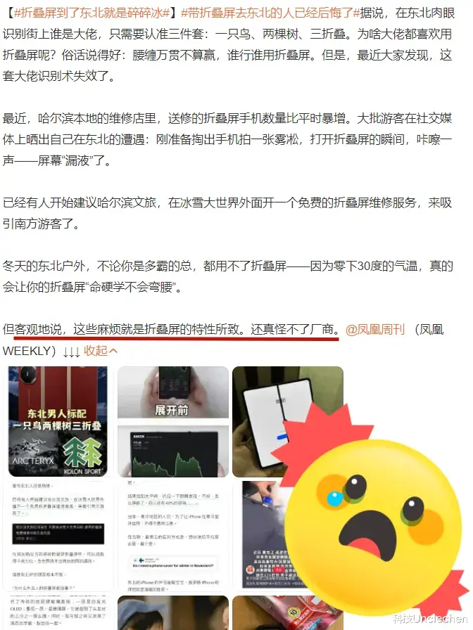 真没想到,不少去哈尔滨旅游的网友晒出惨痛经历:在零下二三十度的户外,折叠屏手机特别容易漏液,维修店排起长队。其实这真不是手机质量差,而是目前折叠屏的材料在极低温下会变脆,强行弯折容易物理性断裂。但转折点可能就在2026年!折叠屏技术或将迎来关键升级,解决这一痛点。据行业爆料,目前三星、苹果、OPPO这边都准备了大招。先来看看三星,在CES上就提前公布无折痕的折叠屏屏幕,从实拍图来看,即便是强光下表现都非常不错,很有可能会在自家的Galaxy Z Fold 8上用到,不排除苹果的首个折叠屏iPhone Fold 也会用上。国产厂商这边,OPPO预计于2026年发布的 OPPO Find N6,可能在铰链和屏幕材料上取得突破,采用更耐低温的新型复合材料,提升设备在极端环境下的可靠性。而且就算你在南方使用,2026年的折叠屏升级点也十分给力。比如有爆料称OPPO Find N6是首款骁龙8E5大折叠屏,也是第一款搭载2亿像素镜头的大折叠;还拥有后置四摄、AI手写笔,应该同样会在影像、AI方面的表现明显提升。所以当前折叠屏在严寒下的“脆弱”是技术过渡期的特征。如果你正考虑购入,不妨稍作等待。2026年的新品,很可能在材料、铰链和电池(应对低温耗电)上全面进化。#折叠屏手机# #OPPO Find N6爆料# #折叠屏手机怎么样# #折叠屏手机怎么选# #苹果折叠屏#