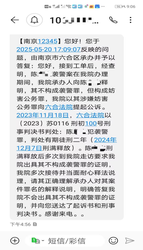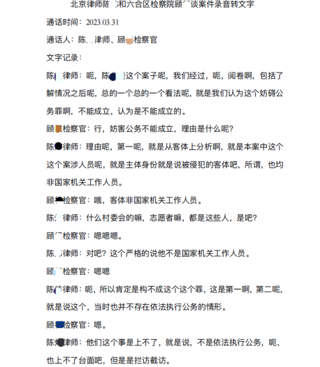 2023年11月18日,陈先生及其两位家人收到法院判决书,三人分别被以“袭警罪”判处有期徒刑一年两人、两年一人。这一结果令他们深感困惑——早在2022年12月19日,检察机关在视频提审时已明确表示“袭警行为不成立”,但当时未出具书面文书。此后,他们多次申请获取相关法律文书未果,并通过12345政务服务热线等渠道反映情况。据其陈述,案件承办检察官曾口头说明“不构成袭警罪”,并承诺将出具书面说明。 2023年3月31日,检察官在与代理律师的通话中进一步确认:“妨害公务罪亦不能成立”,并建议作不起诉处理。然而,法院最终仍以袭警罪作出有罪判决,与此前检察机关的初步意见存在明显出入。