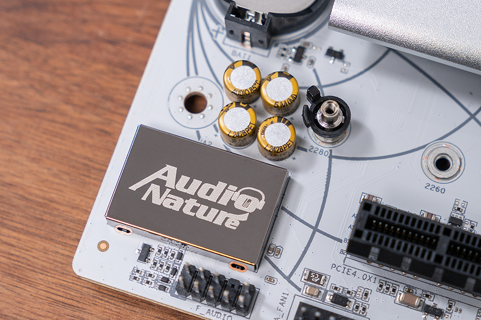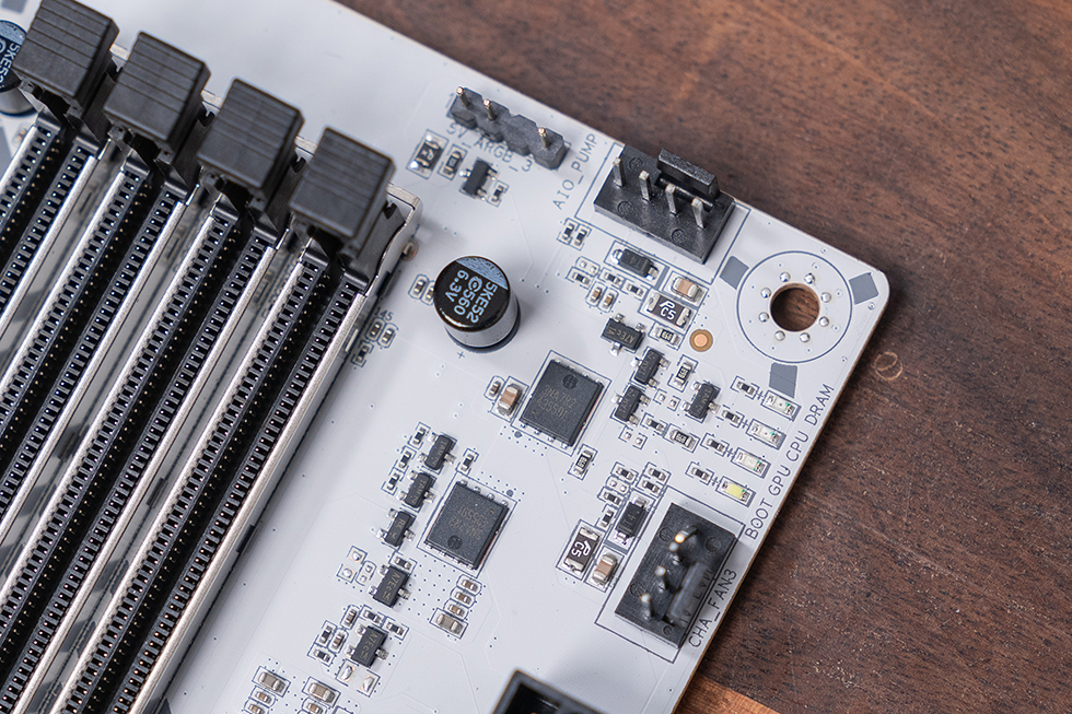 主板采用8 层服务器级别PCB基材,搭载高性能片式聚合物电容,用料十分扎实。采用灰色涂装,辅以白色波谱曲线纹理,将灵动的流线型设计元素贯穿正反两面。