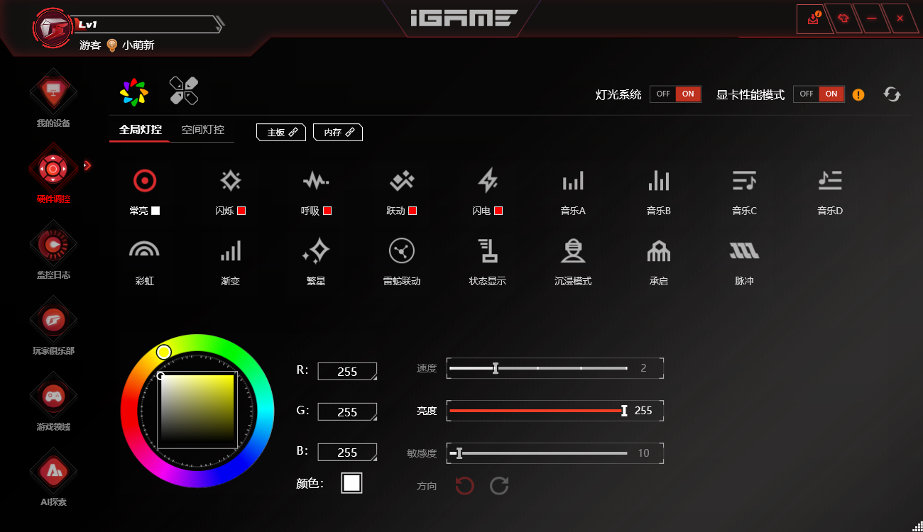 内置RGB灯光控制系统,可独立调节显卡、主板等设备灯效,支持神光同步;