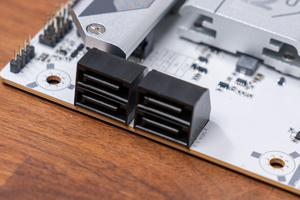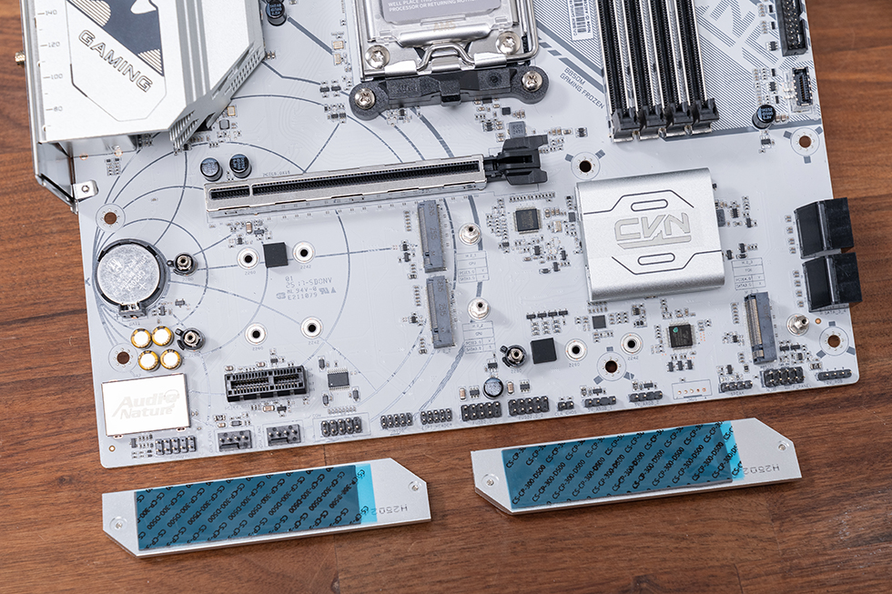 存储方面配备 3 个 M.2 NVMe 插槽,均支持 2280 规格,其中 M.2_1、2 槽支持 PCIe 5.0 x4 通道(直连 CPU),M.2_3 槽支持 PCIe 4.0 x4 通道(连接 PCH),M.2_1、3 插槽均覆盖一体式寒霜散热装甲,装甲预贴导热垫,有效压制固态硬盘的发热,避免高速读写时的降速问题。旋转快拆卡扣设计无需拆卸螺丝,装卸硬盘更便捷,大幅提升装机效率。同时保留 4 个 6Gbps SATA 接口,满足多硬盘扩展需求。