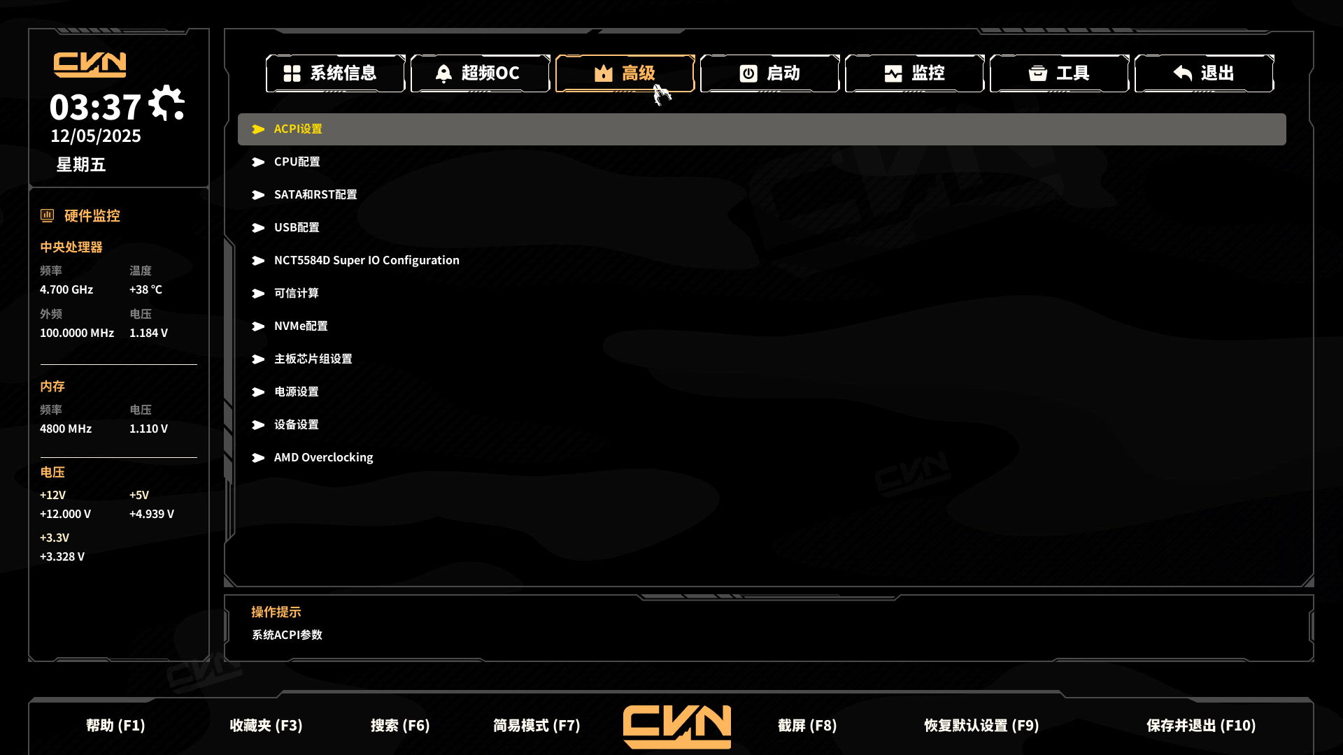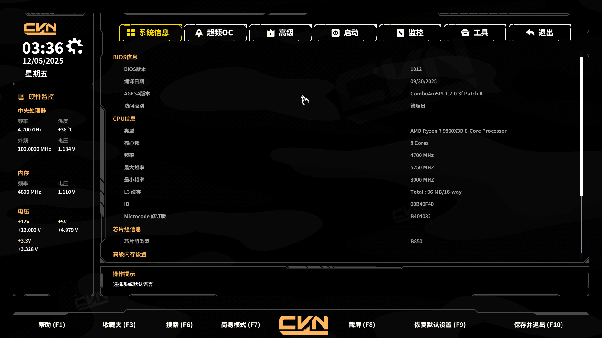 按下键盘上的F7功能键,可在当前操作界面中切换进入高级模式,System(系统)页面在此模式下会完整呈现各类硬件相关信息,具体涵盖硬件监控数据(如实时温度、风扇转速等动态运行指标)、处理器详细信息(包括具体型号、核心/线程数量、当前运行频率、三级缓存大小等技术参数)、内存相关资讯(如总容量、内存类型、运行频率、已用/可用空间占比等)以及各组件电压监测数据(包含CPU核心电压、内存供电电压、芯片组工作电压等关键供电指标),通过分类化布局帮助用户快速掌握系统硬件状态。
