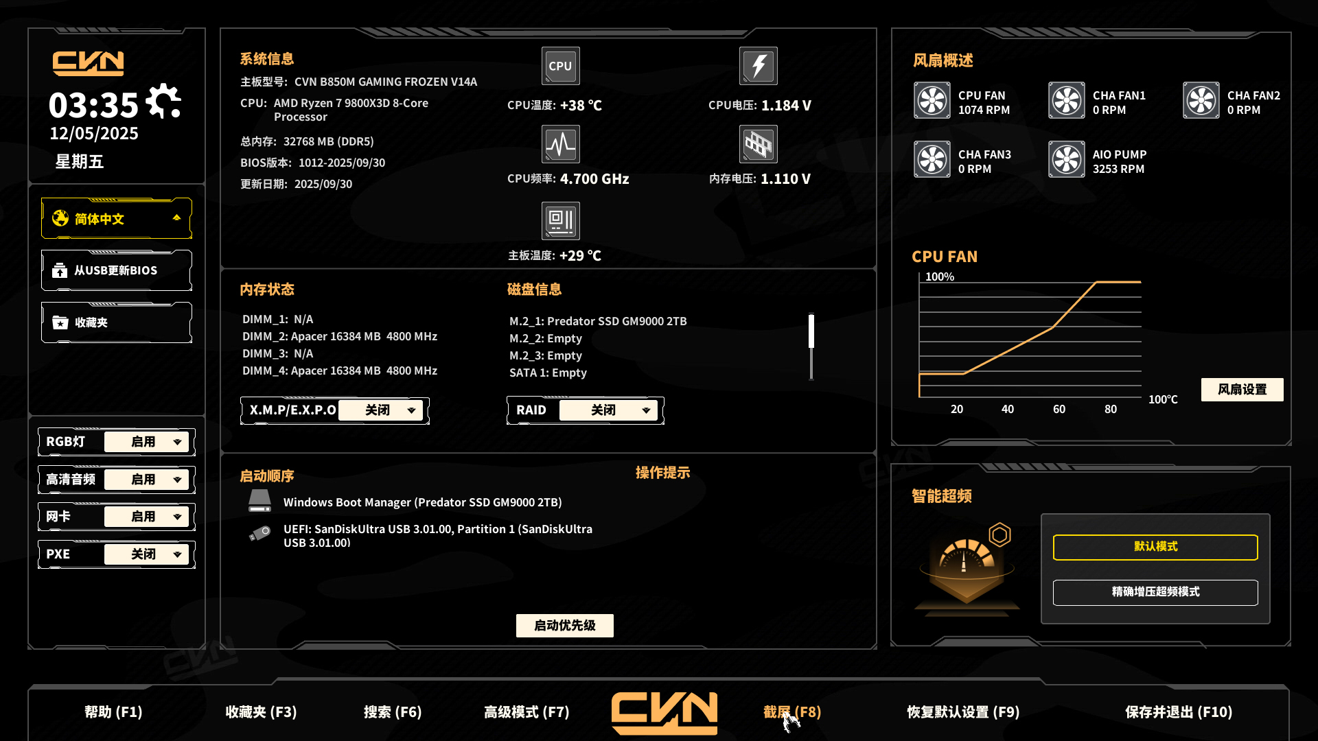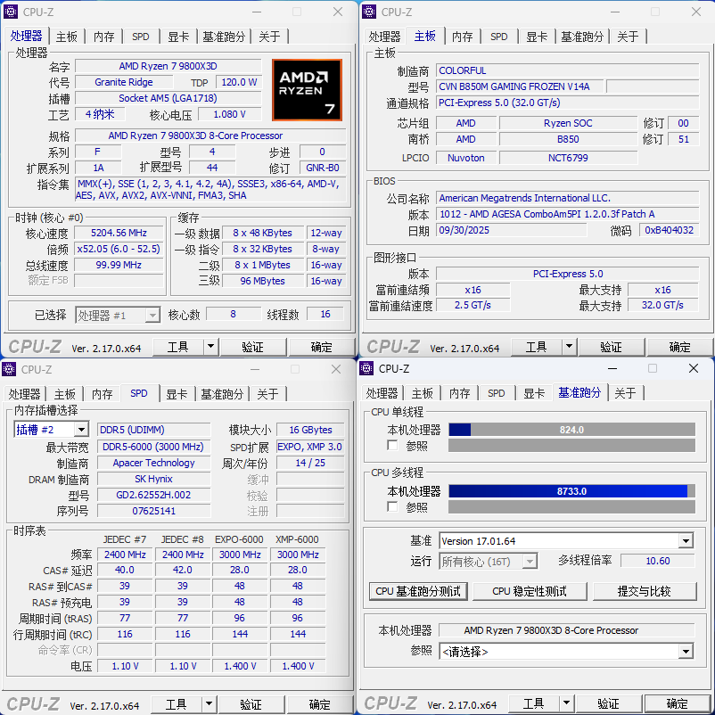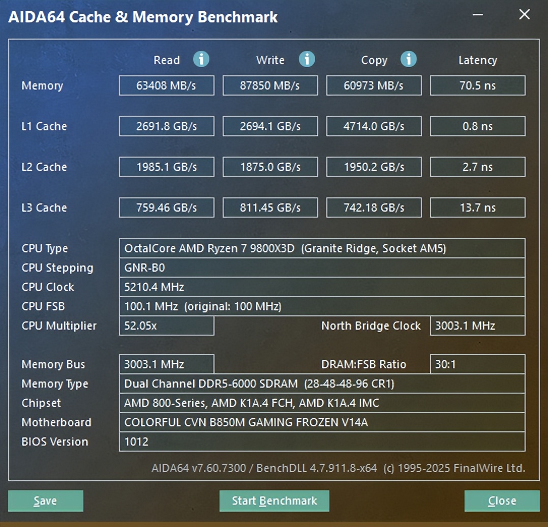 为了全面检验七彩虹 CVN B850M GAMING FROZEN V14A的实际性能,我们搭建了一套主流测试平台,处理器选用 Ryzen 7 9800X3D,显卡为RTX 5070Ti,内存搭配两条 16GB DDR5 6000MT/s 内存,硬盘选用 PCIe 5.0 NVMe SSD,操作系统为 Windows 11 专业版。