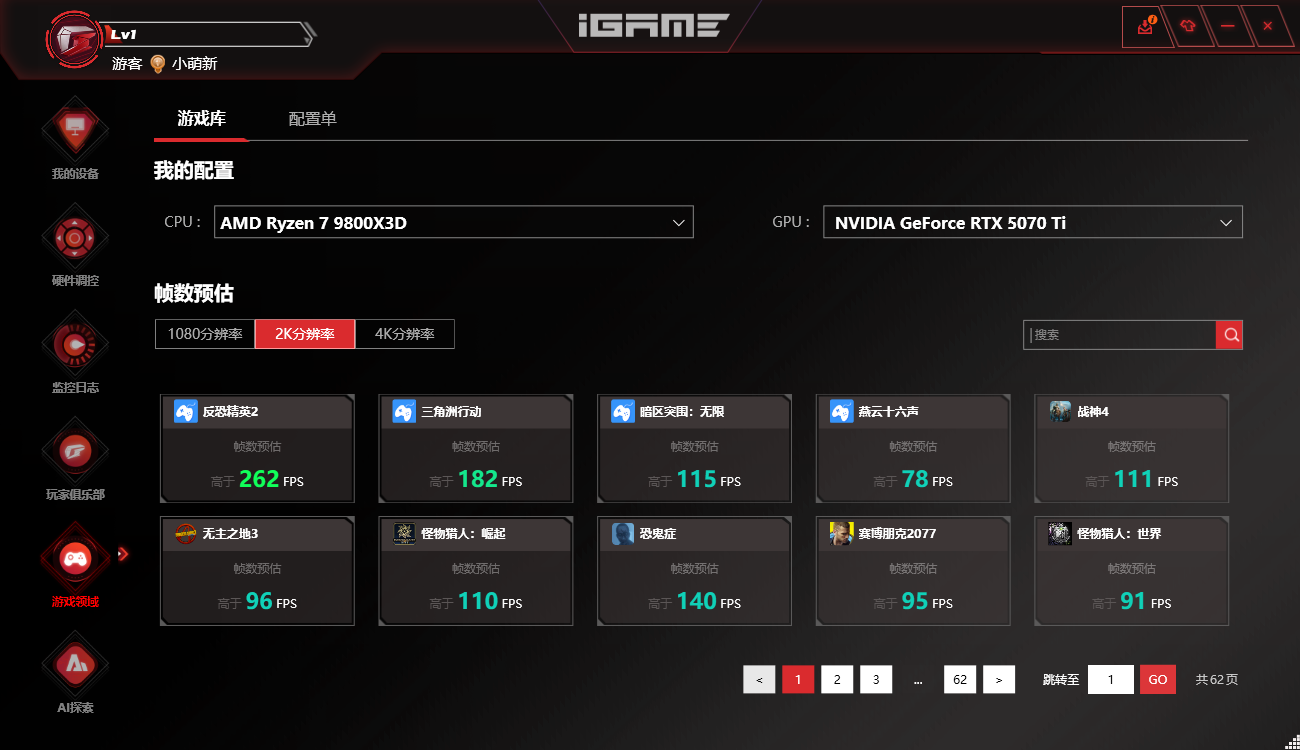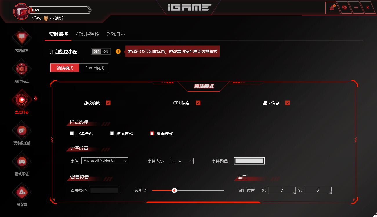 支持CPU/显卡温度、频率等参数动态可视化,提供手动超频及iGame Vulcan显卡侧屏个性化设置;