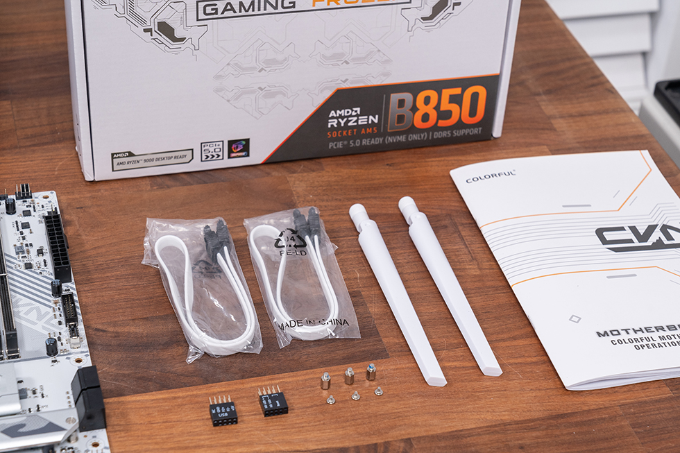 产品解析主板采用白色为主色调的电竞风格的 “GAMING FROZEN” 机甲主题,正面印有产“CVN” 系列及B850M型号标识。打开包装后,附件清单丰富实用:主板本体、可折叠 WiFi 天线、2 根 SATA 3.0 数据线、用户手册、螺丝包、前置USB 2.0扩展插针、前置面板扩展插针和用户说明书。