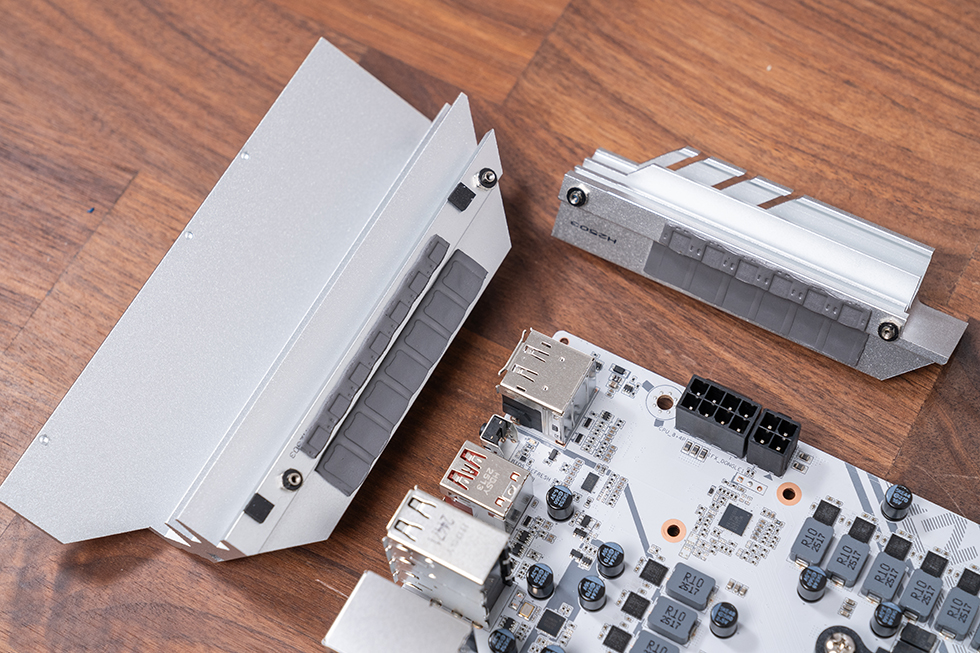 散热方面,VRM 区域覆盖大面积寒霜散热装甲,装甲内部采用多层沟槽设计,配合背部导热垫与 8 层低损耗 PCB,有效降低供电模块温度。