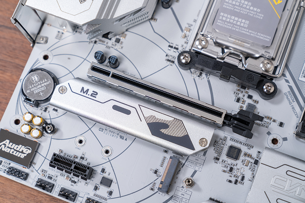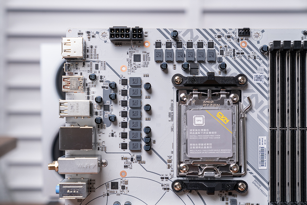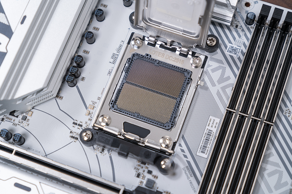主板搭载 AMD AM5 插槽,采用塑料盖保护,预装 CPU 散热器扣具,兼容锐龙 7000//8000/9000 系列处理器,包括旗舰级 锐龙 9 9950X3D。插槽机械结构扎实,插拔手感顺畅,金属卡扣提供稳固固定,确保 CPU 与插槽接触良好。得益于 AM5 接口的 PCIe 5.0 与 DDR5 原生支持,主板可充分释放新一代处理器的性能潜力,同时预留对未来锐龙处理器的兼容性。