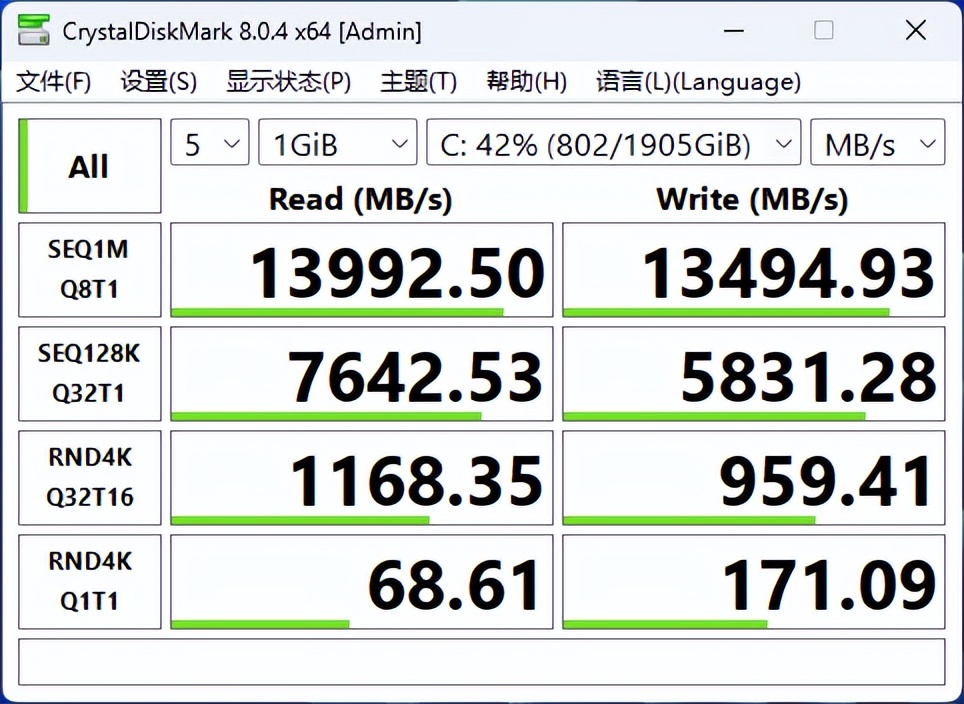 硬盘性能测试场景下,PCIe 5.0固态硬盘在CrystalDiskMark基准测试中,顺序读取速率录得13992MB/s,顺序写入速率达到13494MB/s,已趋近于该硬盘的理论极限速率。较之其在PCIe 4.0接口环境下的表现,性能呈现显著提升,充分释放了PCIe 5.0接口的带宽优势。