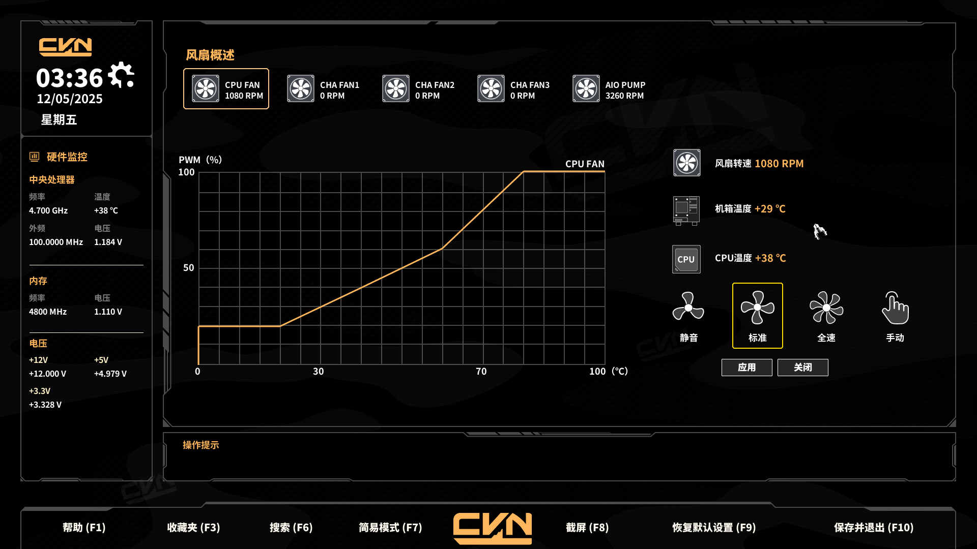 风扇调控功能具备静音、标准、全速及手动四种运行模式。于手动模式下,支持四个节点的精细调节,可依据CPU温度、机箱环境等因素灵活配置风扇转速曲线,实现散热性能与噪音水平的精准平衡。