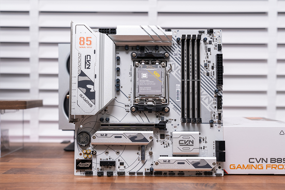主板采用标准 M-ATX 板型(24.4×24.4cm),外观设计延续 CVN 系列银白色主基调,白色 PCB 搭配 CVN 定制寒霜散热装甲,全面覆盖 VRM、IO 接口及 M.2 区域,装甲表面通过冰裂纹激光雕刻、CNC 切割工艺呈现,搭配全覆盖式冷凝片强化散热,兼顾颜值与实用性。背部配备局部金属背板,针对 1.60mm(62mil)PCB 优化设计,既保护主板免受焊点刮伤,又能辅助 VRM 区域散热,同时提升整体质感。