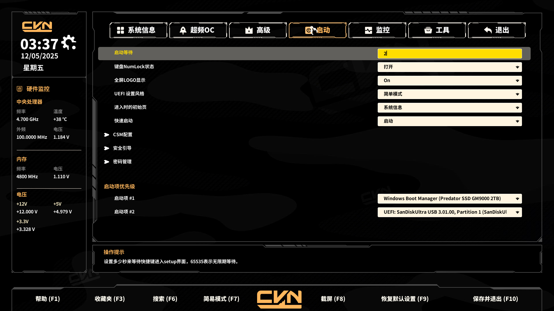 启动页面,对启动选项、CSM、安全以及系统启动磁盘的优先级顺序进行设定。